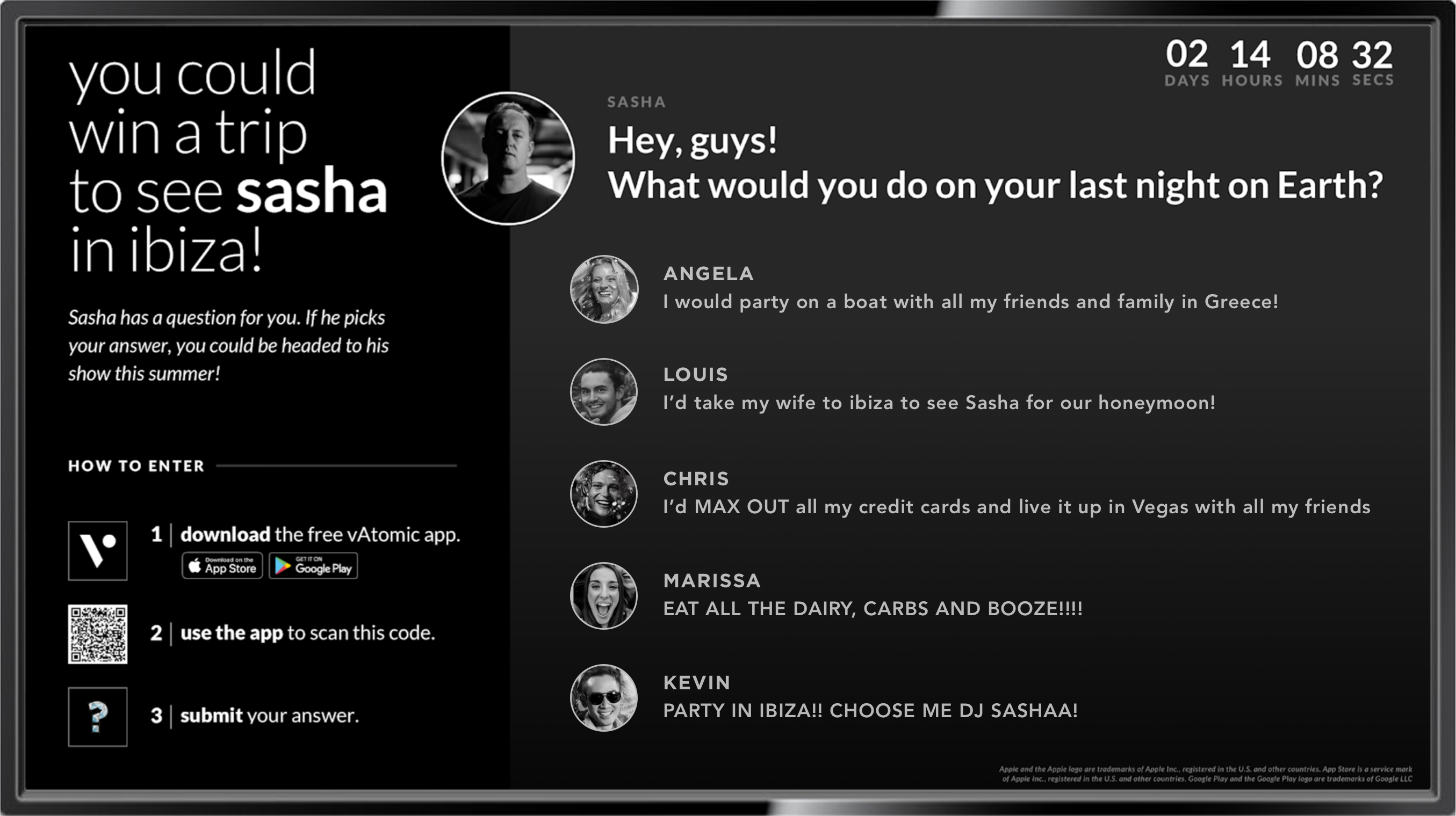 The contest vAtom wasn't revealed until the day of the event and had a 48 hour submission window. We plastered QR codes with contest instructions throughout the yacht and live streamed people's answers on large displays.